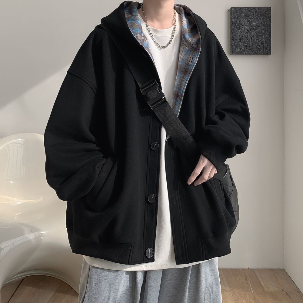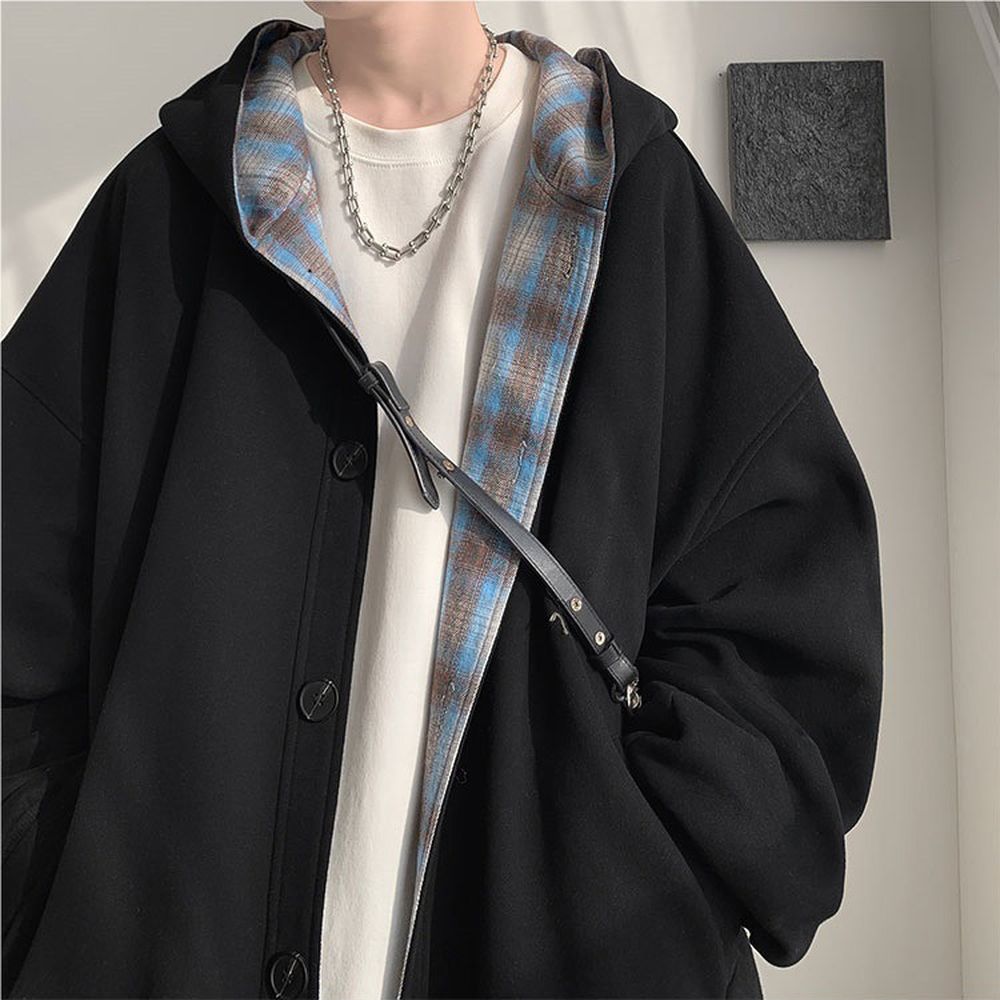 Men's Stitched Plaid Hooded Sweatshirt Trendy Cardigan Jacket